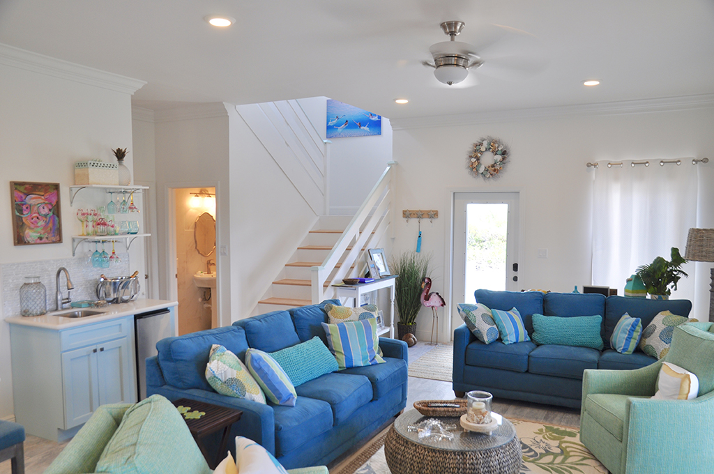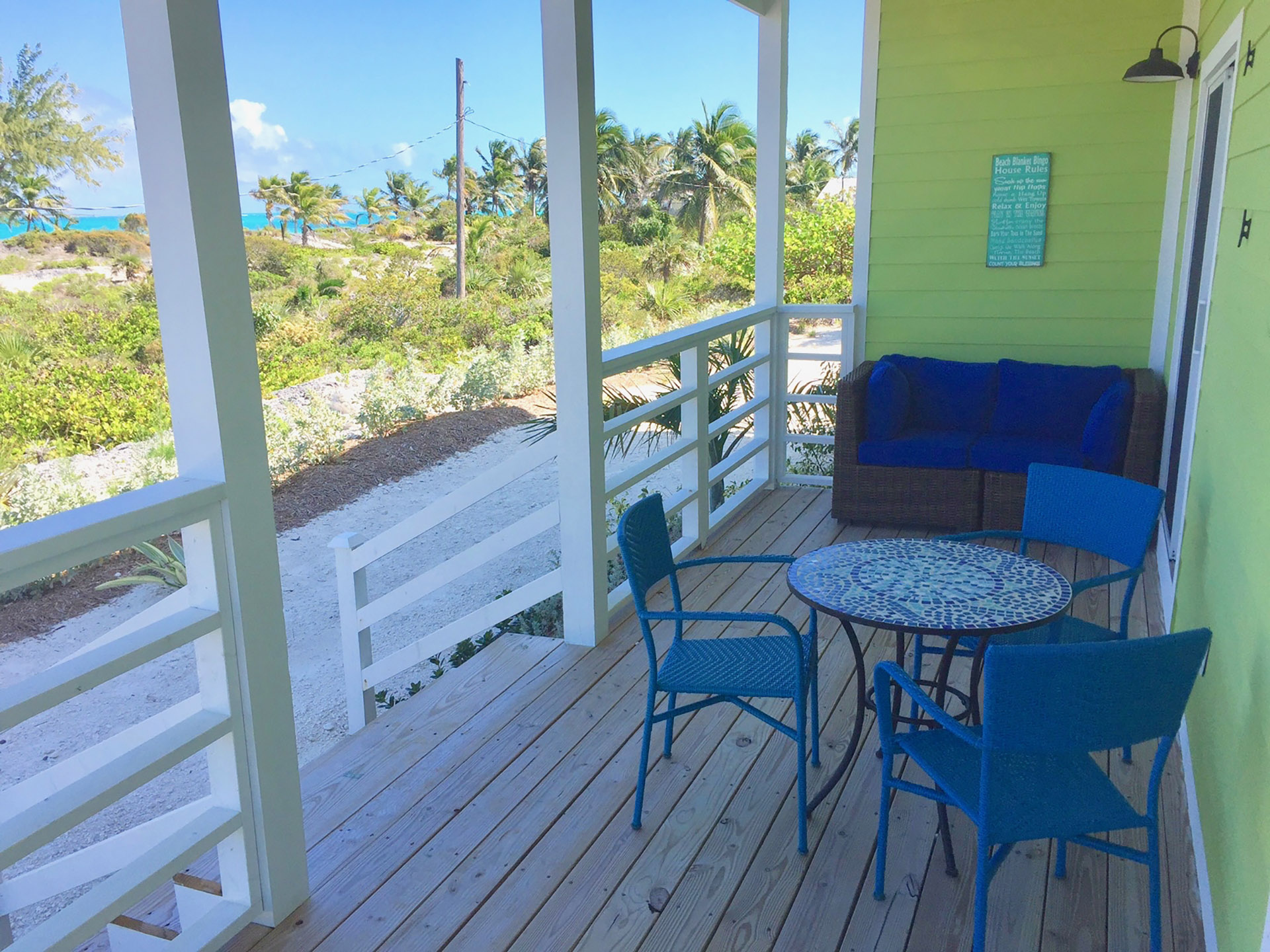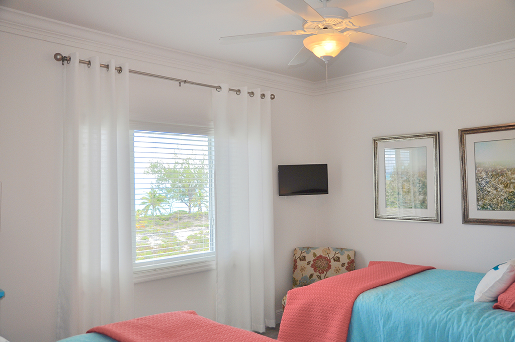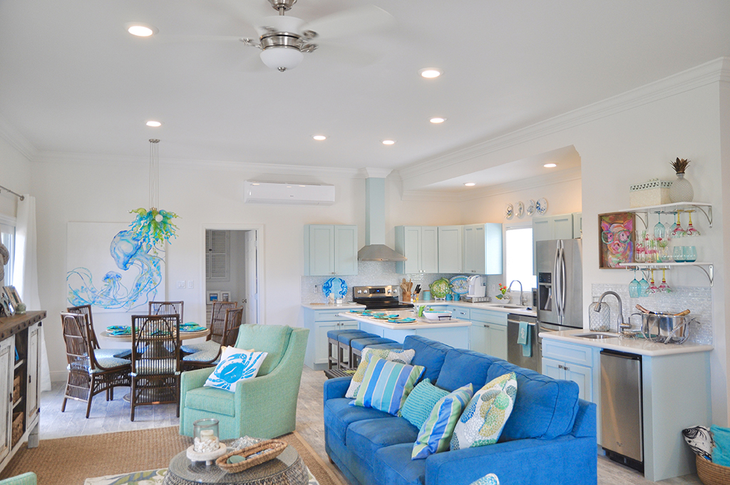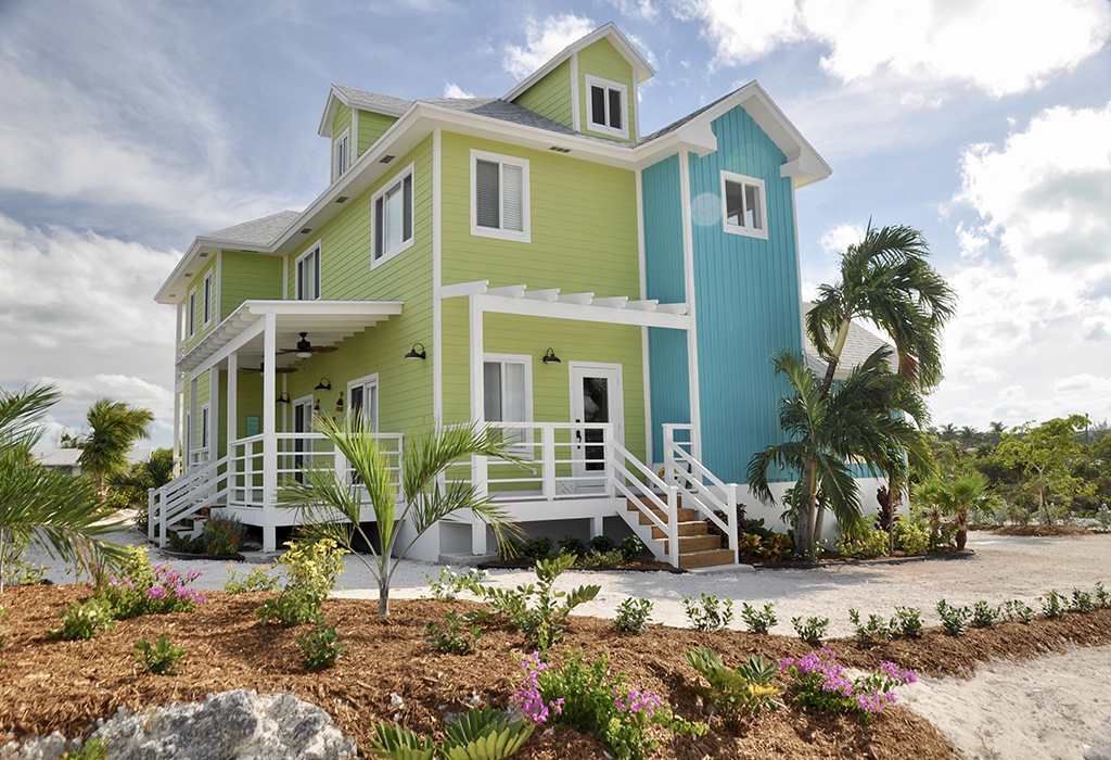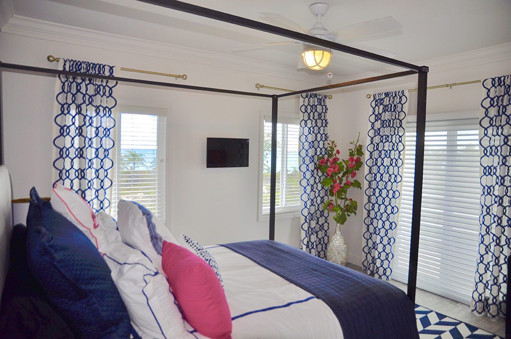 Make the most of your Exuma vacation by booking a stay in the colorful, newly constructed home aptly named Beach Blanket. Owned by model/actress Jena Sims, this 2,600 square-foot house offers four bedrooms, three-and-a-half bathrooms, and three outdoor seating areas. Perfect for families, small groups, or individuals looking to relax in spacious comfort, three of the bedrooms offer Queen-size beds, while the fourth room has two Twin-size beds. The Master bedroom is located on the main floor with an en-suite bath (shower only) and a sliding door leading to a porch. Upstairs is a second Master bedroom, which features a private balcony and an en-suite bath with double vanities and separate shower and bathtub. The additional upstairs bedrooms share another full bath that also has a separate shower and tub.