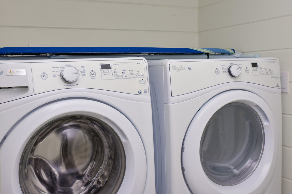 The compact yet efficient laundry area is equipped with a brand new heavy-duty Whirlpool washer and dryer set.