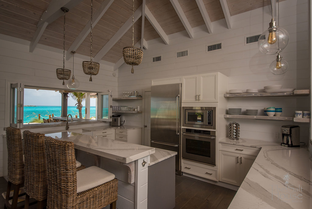 The Salt House features expansive outdoor living spaces. The oceanside centers around a large infinity pool with swaying palm trees and tropical landscaping. Dining alfresco on the covered deck offers endless views – the epitome of Caribbean living. The poolside beach bar was inspired by a rustic Rum Bar, a perfect setting for conversations over an ice-cold Kalik or Goombay Smash. A private outdoor shower off the Beachfront Cottage makes for easy movement between the beach and pool. Evening cocktails are enjoyed on the sunset porch on the front of the house as you bask in the warm sun, watching it set over the western hills.